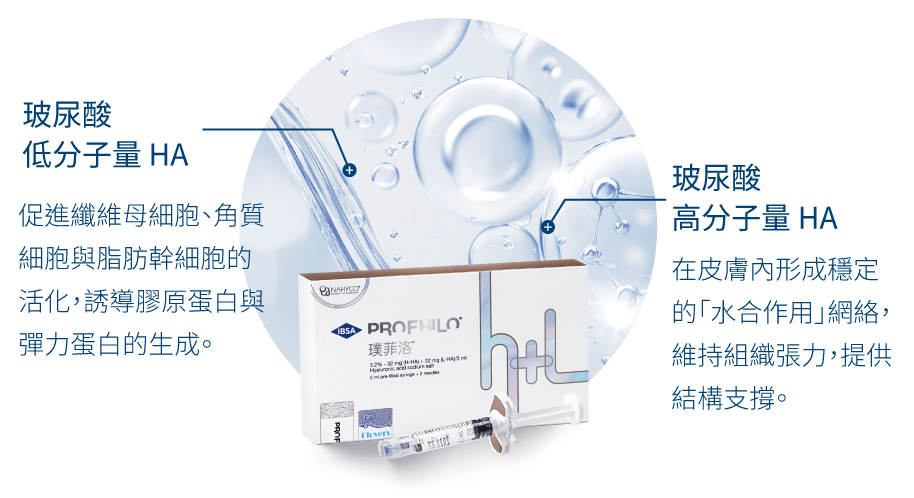 Profhilo 逆時針,採用NAHYCO® Hybrid Technology 專利技術,將「高濃度高分子+低分子玻尿酸」融合,打造出可自然擴散、激活再生、提升彈力的注射型療程,不含交聯劑 BDDE 成分。